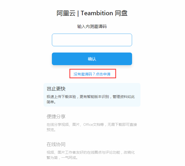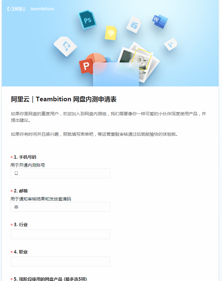 阿里云网盘内测邀请码申请表地址:https://form.teambition.net/f/CjQetM